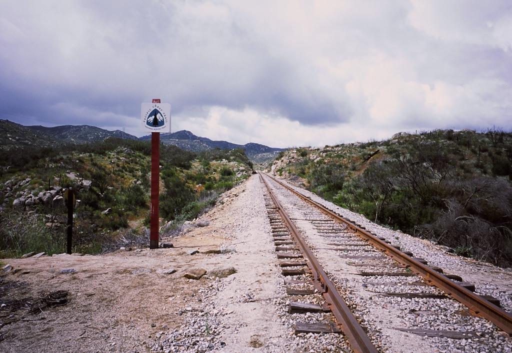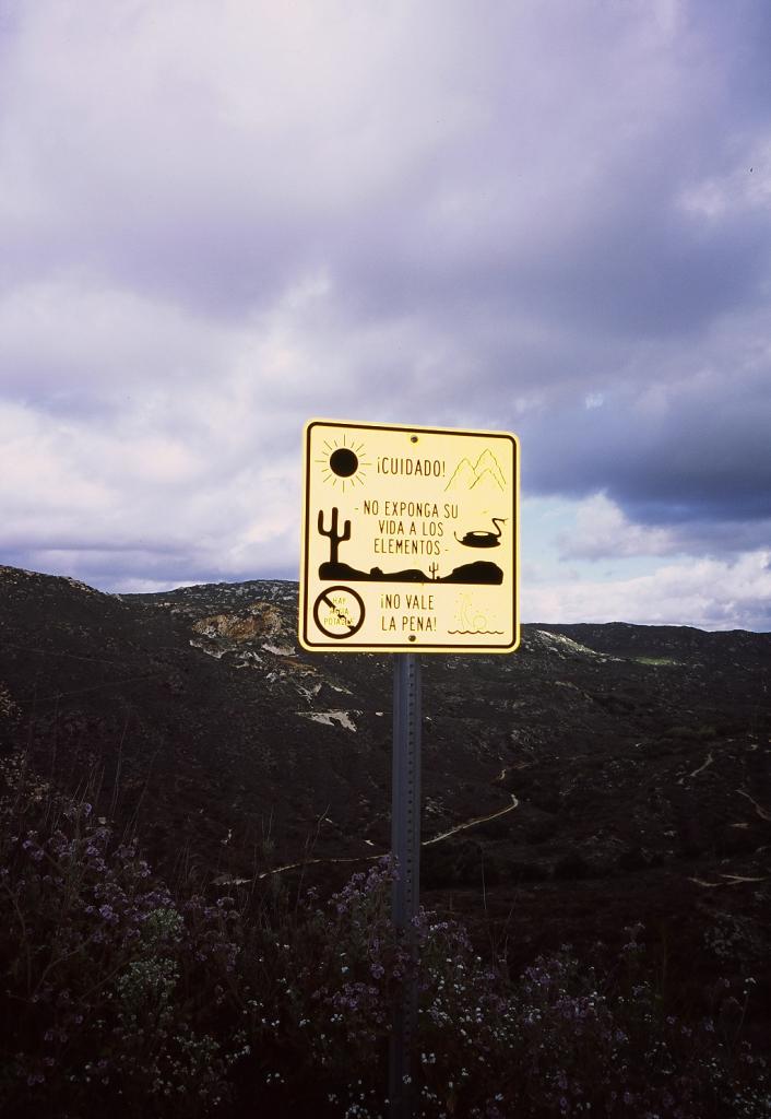 21日の夜半から天候は雨。朝方にはいったん上がったが、その後も降ったり晴れたりの天気が続く。カンポからレイク・モレナまでの20マイルは水場も無く、最初から2日分の水、約3Lを背負って歩く。雨が降っているのに飲み水は無いというしんどいスタート。密入国者むけだろうか、スペイン語で書かれた看板があちこちに建っている。