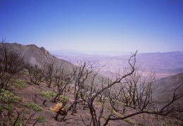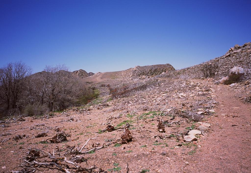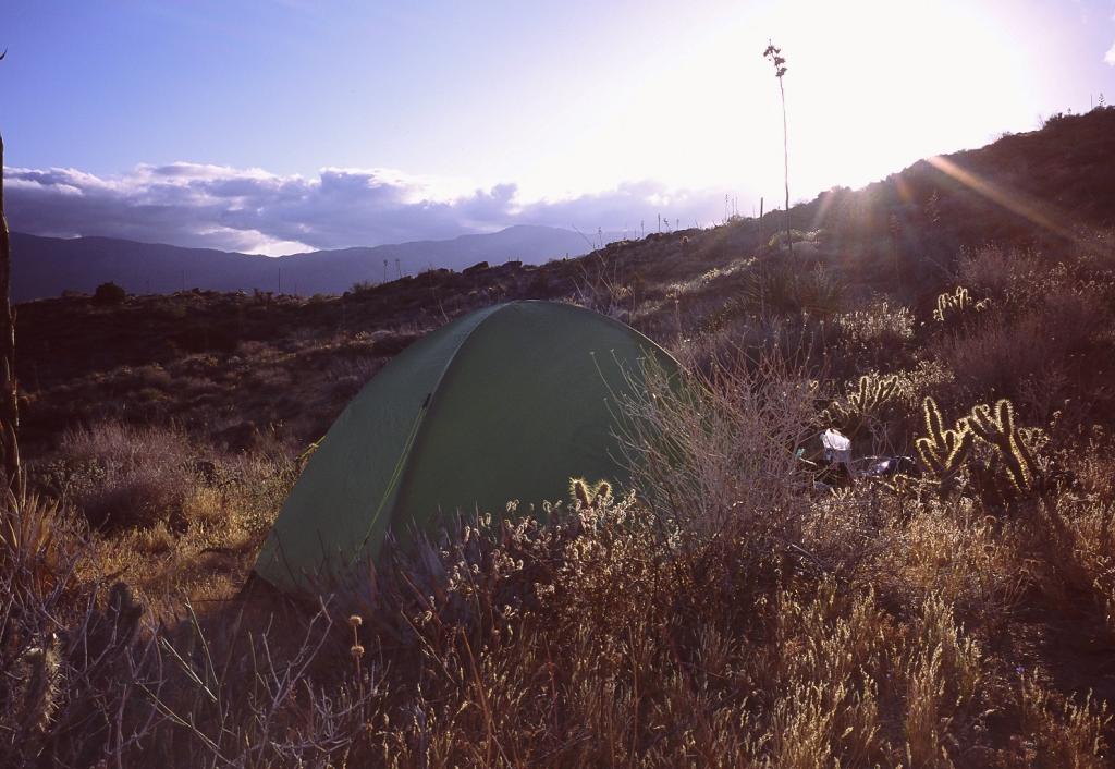 5時40分起床。手早く荷造り。トレイルミックスを水で流し込む。/6時半出発。トレイルに戻る。水を少なく持ってきたのが気になる。/ダグとジョンは結構早い。荷物が重いせいもあるが息が上がる。/11時ごろまでは何とか追走できたが、それ以降は追いつけず。/暑い日で水の消費量も多い。/14時 チワワ・キャニオンでパットおばさん。本当に助かる。水が無ければ結構大変なところだった。/17時過ぎまで歩いてテントを張る。/夕食はすき焼き丼&焼き鳥丼。一日一本のタバコがしみる。 Today 19.6Mi Total 130.2Mi