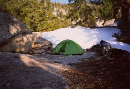 6時起床。昨夜はフリースを着て寝ても、寒さで何度も目が覚めた。/テントが凍っている。一晩中風と雨は強かった。/恐る恐るテントの外をのぞくと青空が垣間見える。/お茶を入れて、クリフバーとカロリーメイトの朝食。/濡れた靴に足を入れるのは気合が必要だ。/昨日と一転して天気はいい。しかし、日陰に入ると雪がガチガチに凍っている。/今日はまだ誰もトレイルを歩いていないらしく、足跡も無い。一歩一歩、雪に足を蹴りこみながら進む。/途中で積雪のためトレイルを見失う。後からきたおじさんと地形をたよりにクロスカントリー。/1330サドルジャンクション、1430トレイルヘッド着。助かった。・・・/Today 9.7Mi Total180.2Mi