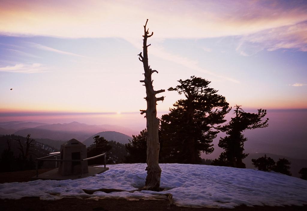午前7時起床。Johnは早く起きてコーヒーを入れてくれていた。/7時過ぎにばらばらと起床。朝食は出してくれないらしく、皆適当に食べていたので僕もベーグルとバナナをかじる。/Johnは8時過ぎにトレイルへ戻っていった。/いったい、今日これからどうなるのかはっきりしない。Jolyおばさんも姿を見せない。/DieselとGrahamは一日ここでステイするという。ロード・オブ・ザ・リングを見始める。/郵便局での荷物のPickupが不安になってきたのでDieselに郵便局へTELしてもらうが、荷物は今日になっても届いていないとのこと。/北米支店氏にTEL、状況を説明するもシカゴにいるとのことでいかんともしようがない。箱は月曜日にレギュラーで送ってもらったが、やはりPriolityでないとこの国の郵便事情は当てにならないようだ。/Dieselに頼んで、郵便局の局員に荷物が届いたらテハチャピに転送してもらうよう依頼。/居心地が悪いのでとりあえずトレイルに戻りたい。/パトリックとハッピーが合流。/よくわからんがますます居心地が悪い。/彼らは映画を見に行くとか言っているので、Dieselに手紙の投函を依頼して彼らと別れる。/DanとJolyは不在だったので子供によろしく伝えて家を出る。/Hwyに出て、初めてのヒッチハイク。4台目で捕まえる。/PCTハイカーだというと荷台に乗せてくれた。/小さな子供4人を乗せたおっちゃん。いい経験になった。/13時、トレイルに戻る。15時VincentGap/16時 LamelSpring。ここでキャンプするつもりだったが、水はあるがスペースがない。/仕方なく水を担いで頂上を目指す。/17時45分、Mt.Baden-Powell山頂。やはり、ボーイスカウトのB-Pだった。感動。/山頂にテントを張る。8500フィートから上は雪で埋まっていた。/夕食はビーフジャーキー、パワーバー、チーズ、味噌汁。/20時ごろ、日が沈む。いい夕焼けだった。/街もいいけど、やはり自然の中がいい。幸せな夕暮れの時間。写真を何枚も撮る。/補給ができなかったのでお茶がないのが残念。/松本さんにTEL、明日のピックアップについて再確認。電話が通じてよかったが、電池が危ない。充電器は箱の中。/明日、松本さんのサポートを受けて体制を立て直そう。一人のテントが落ち着くなあ。/風が強くなってきた。天候が悪化しないことを祈ろう。 Today 8.4Mi Total 380.3Mi