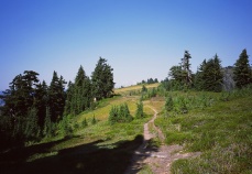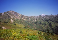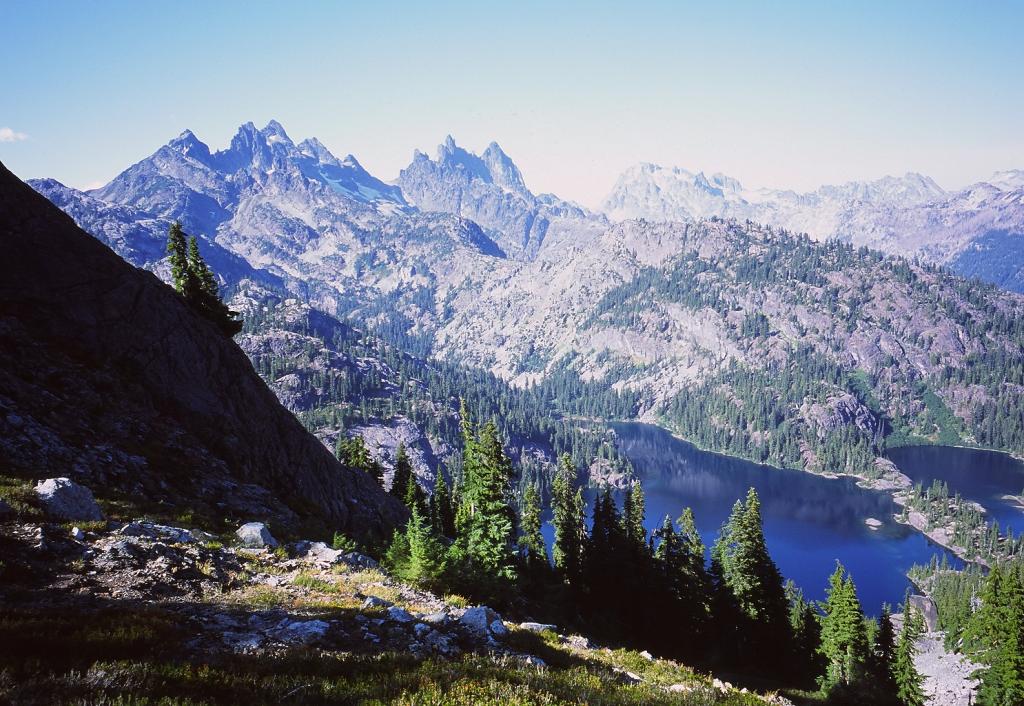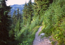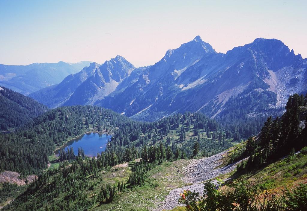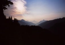 6時半起床。眠い。/パッキングしていると小雨がぱらつく。念のためゴミ袋を中に入れてパックし直し。雨具を着て出発。/雨はすぐあがり、30分ほどで雨具は脱ぐ。/ここで、サングラスを忘れたことに気づく。餞別にいただいたもので、結構気に入っていただけに残念。まあ、サングラスをなくしやすい僕にしては良く寿命はもったほうだが。/やや気落ちして最初のパスを越える。/下りかけのところで逃げていく熊の後ろ姿を見る。/Milk Lakeで裸のおばちゃんと遭遇。/長いスイッチバックの下り、上り。ペースが上がらない。体が重い。/split-peaにはなかなか追いつけず。ひとりで延々と続くスイッチバックを歩く。かなり、飽きる。/3時過ぎに追いつき、そのあとはほぼ同じペースで歩く。/今日も大汗をかき続ける。シャツがこれまでに無いほど汗まみれ。/最後の上りを気合であがる。/18:30頃、再び熊と遭遇。写真は撮れず。でかかった。/19:15、Passを越えたところでキャンプ。/夕食は人生最後にしたいM'c&Cheese。日本食、日本娘が恋しい。/明日はeasyなトレイルでStehekinだ。甘いものが飲みたい。 Today 26.2 Total 2550.6